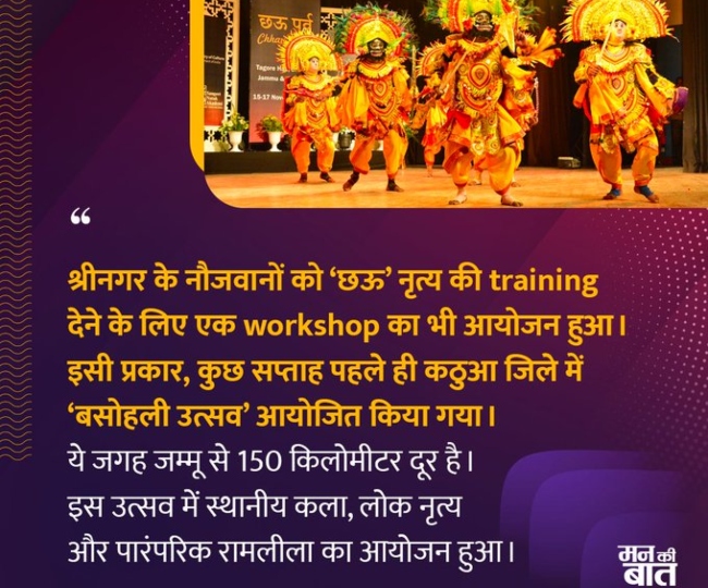 झारखण्ड, ओडिशा और बंगाल के जन-जातीय इलाकों में एक बहुत प्रसिद्ध नृत्य है, जिसे 'छऊ' के नाम से बुलाते हैं। 15 से 17 नवम्बर तक 'एक भारत श्रेष्ठ भारत' की भावना के साथ श्रीनगर में 'छऊ' पर्व का आयोजन किया गया। इस कार्यक्रम में सबने 'छऊ' नृत्य का आनंद उठाया।