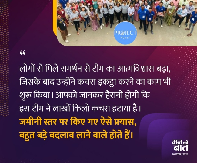 पीएम मोदी ने कहा, "मेरे परिवारजनों, राष्ट्र निर्माण की कमान जब जनता-जनार्दन संभाल लेती है, तो दुनिया की कोई भी ताकत उस देश को आगे बढ़ने से नहीं रोक पाती है। आज भारत में भी स्पष्ट दिख रहा है कि कई परिवर्तनों का नेतृत्व देश की 140 करोड़ जनता ही कर रही है।"