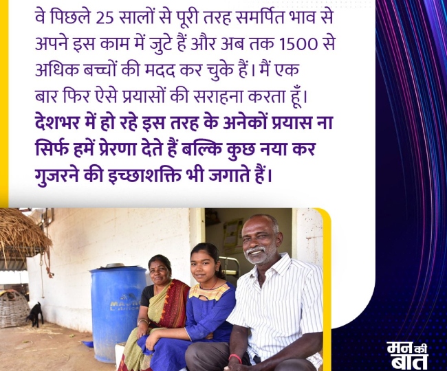 पीएम मोदी ने तमिलनाडु के कोयंबटूर के रहने वाले लोगानाथन का जिक्र किया। पीएम मोदी ने कहा कि बचपन में गरीब बच्चों के फटे कपड़ों को देखकर वे अक्सर परेशान हो जाते थे। इसके बाद उन्होंने ऐसे बच्चों की मदद का प्रण लिया और अपनी कमाई का एक हिस्सा इन्हें दान देना शुरू कर दिया।