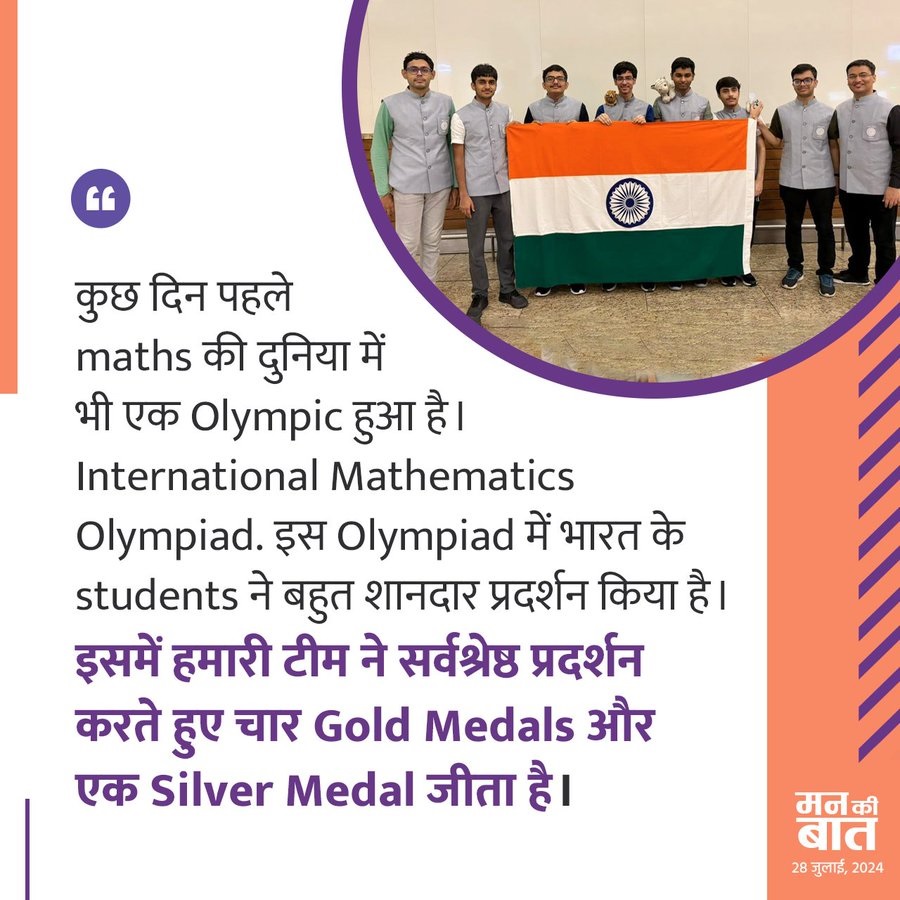 पीएम ने बताया कि इसमें हमारी टीम ने सर्वश्रेष्ठ प्रदर्शन करते हुए चार गोल्ड मेडल एक सिल्वर मेडल जीता है। पीएम ने कहा कि International Mathematics Olympiad में 100 से ज्यादा देशों के युवा हिस्सा लेते हैं और संपूर्ण टैली में हमारी टीम टॉप फाइव में आने में सफल रही है। पीएम ने इसी के साथ देश का नाम रोशन करने वाले छात्रों से बात की।