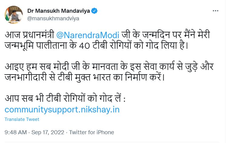 इसके साथ ही मंडाविया ने ट्विटर पर लोगों से टीबी रोगियों को गोद लेने का आग्रह किया है। मंडाविया ने ट्विटर पर लिखा, 'आज प्रधानमंत्री नरेन्द्र मोदी के जन्मदिन पर मैंने अपने जन्मस्थान पलिताना से 40 टीबी रोगियों को गोद लिया है। आइए हम सब मोदी जी की मानवता के इस सेवा कार्य में शामिल हों और जनभागीदारी से टीबी मुक्त भारत का निर्माण करें। आप सभी को भी टीबी मरीजों को अपनाना चाहिए।' इसके साथ ही उन्होंने एक लिंक https://communitysupport.nikshay.in, भी शेयर किया है।