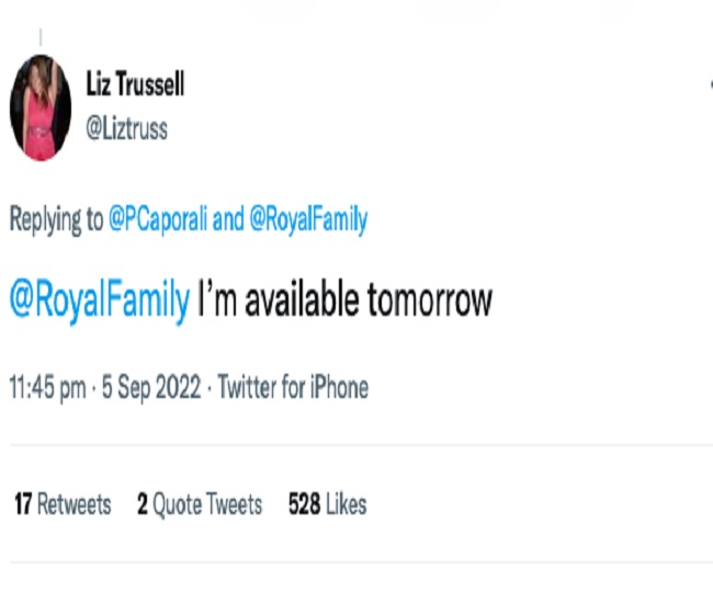ट्रस को ब्रिटेन की कंजर्वेटिव पार्टी का प्रमुख चुना गया था। यह पहली बार नहीं है जब गलत ट्विटर पहचान के मामले ने किसी ब्रिटिश प्रधानमंत्री को प्रभावित किया है। एनपीआर ने बताया 2017 में, तत्कालीन राष्ट्रपति डोनाल्ड ट्रम्प ने तत्कालीन पीएम थेरेसा को एक ट्वीट में टैग करना था, लेकिन उन्होंने इसके बजाय theresamay, एक ब्रिटिश महिला को टैग किया था।