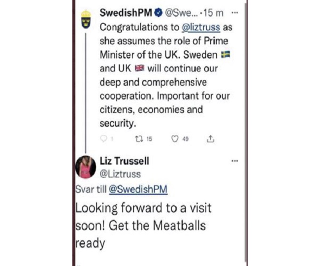 स्वीडिश प्रधानमंत्री ने trussliz को टैग करके यूके के प्रधानमंत्री को बधाई दी, महिला ने जवाब दिया "जल्द ही एक यात्रा के लिए तत्पर! मीटबाल तैयार हो जाओ।"