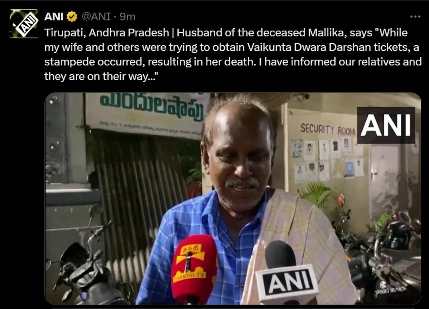 मृतक मल्लिका के पति का कहना है कि जब मेरी पत्नी और अन्य लोग वैकुंठ द्वार दर्शन टिकट प्राप्त करने की कोशिश कर रहे थे, तो भगदड़ मच गई, जिसके परिणामस्वरूप उनकी मृत्यु हो गई। मैंने अपने रिश्तेदारों को सूचित कर दिया है और वे रास्ते में हैं।