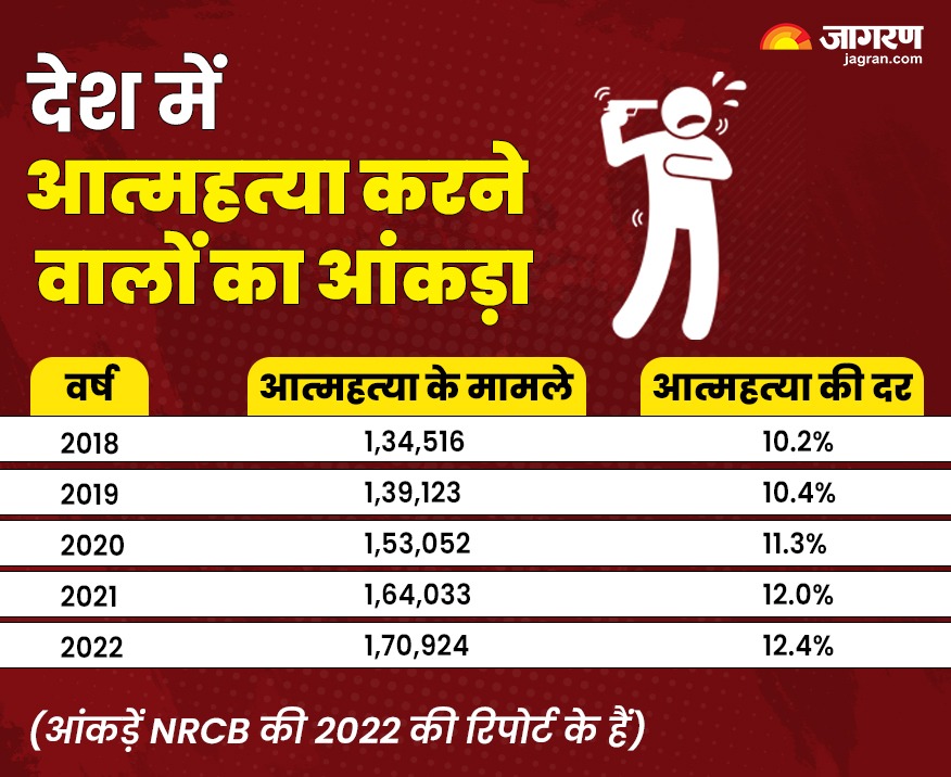 नेशनल क्राइम रिकॉर्ड ब्यूरो (NCRB) की 2022 की रिपोर्ट के मुताबिक, साल 2022 में 1 लाख 71 हजार लोगों ने आत्महत्या की थी। देश में सुसाइड रेट ने रिकॉर्ड तोड़ दिया। इसी के साथ दुनिया में सुसाइड करने के मामले में भारत टॉप पर आ गया।