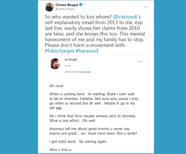 इसके बाद चेतन भगत ने अपने बचाव में कथित रूप से इरा का भेजा हुआ एक ईमेल भी सार्वजनिक कर दिया है। चेतन ने ट्वीट में लिखा, 'तो कौन किसे चूमना चाहता था?. इरा त्रिवेदी का खुद से सब कुछ बयां करता ई-मेल जो उन्होंने 2013 में मुझे भेजा था। खासकर आखिरी वाक्य, आसानी से ये दिखाता है कि उनका 2010 का दावा गलत है। यह उन्हें भी मालूम है। मेरे और मेरे परिवार के साथ मानसिक प्रताड़ना रुकनी चाहिए। कृपया गलत आरोपों से आंदोलन को क्षति न पहुंचाइए। कथित ई-मेल संदेश की आखिरी लाइन में लिखा है, 'Miss u kiss u'