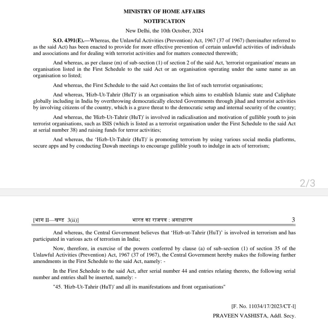 केंद्रीय गृह मंत्रालय की ओर से जारी अधिसूचना में कहा गया है कि एचयूटी भोले-भाले युवाओं को कट्टरपंथी बनाने, उन्हें आईएस जैसे आतंकी संगठनों में शामिल होने के लिए प्रेरित करने और आतंकी गतिविधियों के लिए धन जुटाने में शामिल है। एचयूटी विभिन्न इंटरनेट मीडिया प्लेटफार्मों व सिक्योर एप्स का इस्तेमाल करके आतंकवाद को बढ़ावा दे रहा है और दावाह (आमंत्रण) बैठकें आयोजित करके भोले-भाले युवाओं को आतंकी गतिविधियों में शामिल होने के लिए प्रोत्साहित कर रहा है।