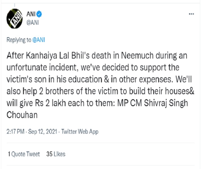 भोपाल, एएनआइ। मध्य प्रदेश के नीमच जिले में हुई हैवानियत घटना में आदिवासी युवक कन्हैया लाल भील की मृत्यु के बाद मुख्यमंत्री शिवराज सिंह चौहान ने पीड़ित के परिजनों को मदद देने का एलान किया है। मुख्यमंत्री ने कहा कि एक दुर्भाग्यपूर्ण घटना के दौरान नीमच में कन्हैया लाल भील की मृत्यु के बाद हमने पीड़ित के बेटे की शिक्षा और अन्य खर्चों में समर्थन करने का फैसला किया है। साथ ही सीएम ने कहा,'हम पीड़िता के 2 भाइयों को भी घर बनाने में मदद करेंगे और प्रत्येक को 2 लाख रुपये देंगे।'
