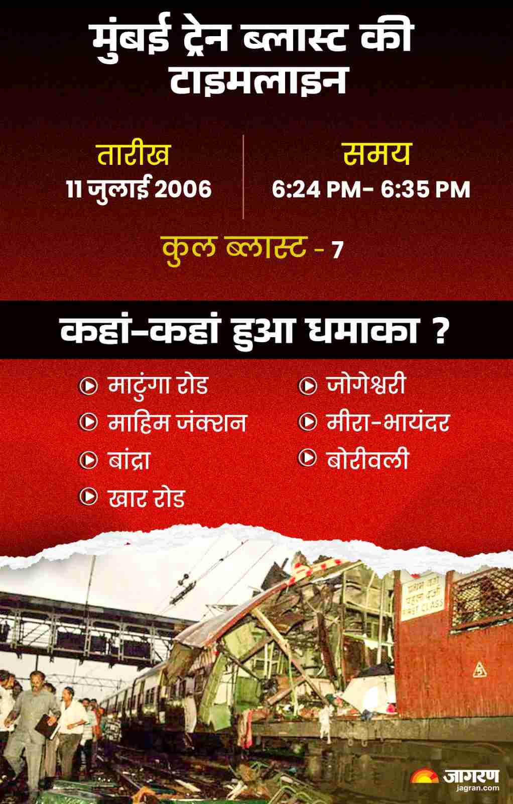 डिजिटल डेस्क, मुंबई। 11 जुलाई 2006...शाम के लगभग 6:24 बजे थे। मुंबई के स्टेशनों पर दफ्तर से लौट रहे लोगों की भारी भीड़ थी। मायानगरी की लाइफलाइन कही जाने वाली लोकल ट्रेनें भी यात्रियों से खचाखच भरी थीं। तभी अचानक एक जोरदार ब्लास्ट हुआ। धमाके की आवाज सुनते ही स्टेशन पर भगदड़ मच गई। इससे पहले की लोग कुछ समझ पाते एक के बाद एक लगातार सात लोकल ट्रेनों में हुए बम ब्लास्ट ने पूरी मुंबई को हिलाकर रख दिया।