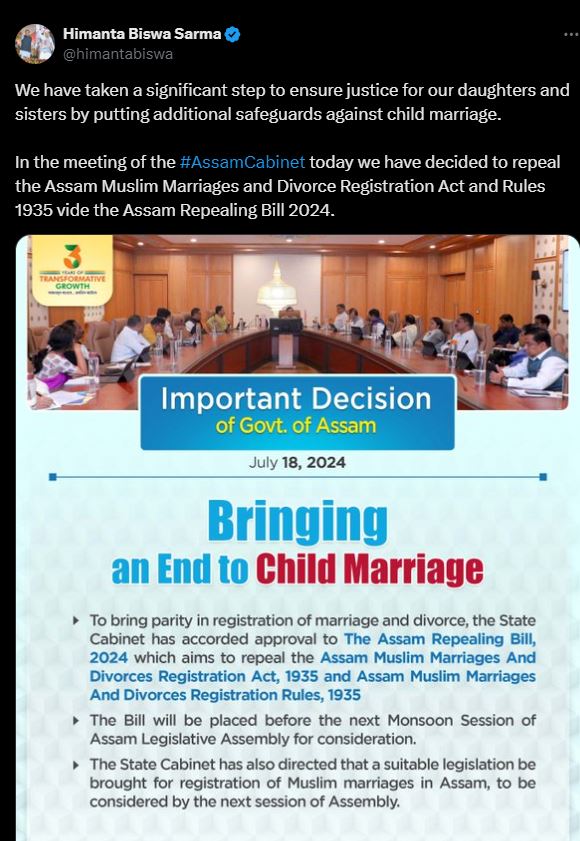 मुख्यमंत्री सरमा ने कहा, 'हमने बाल विवाह के खिलाफ अतिरिक्त सुरक्षा उपाय करके अपनी बेटियों और बहनों के लिए न्याय सुनिश्चित करने के लिए एक महत्वपूर्ण कदम उठाया है। आज असम कैबिनेट की बैठक में हमने असम निरसन विधेयक 2024 के जरिए असम मुस्लिम विवाह और तलाक पंजीकरण अधिनियम 1935 को निरस्त करने का निर्णय लिया है।'