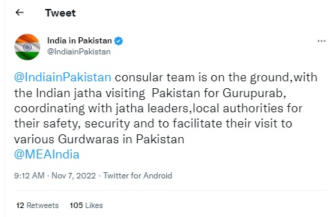 वहीं पाकिस्तान स्थित भारतीय दूतावास ने ट्वीट कर कहा कि भारतीय जत्थे गुरुपरब के लिए पाकिस्तान जा रहे हैं, उनकी सुरक्षा के लिए स्थानीय अधिकारियों के साथ समन्वय किया जा रहा है। पाकिस्तान के विभिन्न गुरुद्वारों में उनकी यात्रा को सुविधाजनक बनाने के लिए कांसुलर टीम कार्य कर रही है।