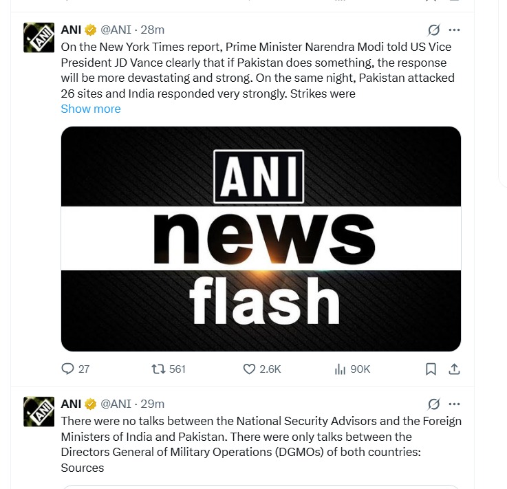 भारत ने साफ कर दिया था कि पाकिस्तान ने फोन कर भारत से सीजफायर की गुजारिश की थी। अब समाचार एजेंसी एएनआई ने न्यूयॉर्क टाइम्स की रिपोर्ट से हवाले से दावा किया है कि पीएम नरेंद्र मोदी और अमेरिकी उपराष्ट्रपति जेडी वेंस के बीच बातचीत हुई थी, जिसमें पीएम ने वेंस को दो टूक शब्दों में भारत का स्टैंड समझा दिया था।