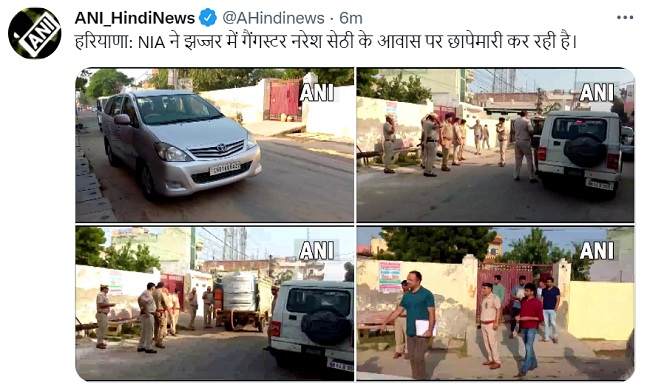 राष्ट्रीय जांच एजेंसी (NIA) की टीम हरियाणा के झज्जर में गैंगस्टर नरेश सेठी के आवास पर छापेमारी कर रही है। बता दें कि गैंगस्टर नरेश सेठी के आवास के बाहर पुलिस बल की तैनाती की गई है। झज्जर के DSP रविंदर कुमार कुंडू ने बताया कि यहां पर करीब 4 घंटे सर्च अभियान चलाया गया है, जिसके बाद NIA की टीम रिपोर्ट तैयार कर अपने साथ लेकर गई है। NIA की टीम अपने विभाग को रिपोर्ट सौपेंगे।
