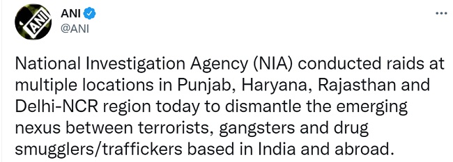 जानकारी के अनुसार, राष्ट्रीय जांच एजेंसी (NIA) ने भारत और विदेशों में स्थित आतंकवादियों, गैंगस्टरों और मादक पदार्थों के तस्करों के बीच उभरती नेक्सेस को खत्म करने के लिए ये कार्रवाई की है। NIA ने पंजाब, हरियाणा, राजस्थान और दिल्ली-एनसीआर समेत देश के कई राज्यों में छापेमारी की है।