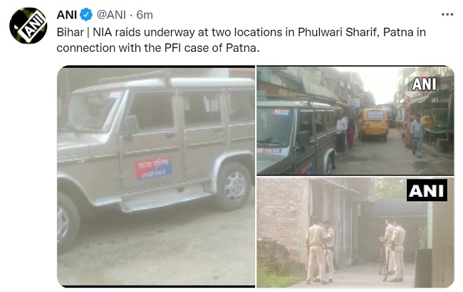 वहीं, पीएफआई मामले में राष्ट्रीय जांच एजेंसी द्वारा पटना के फुलवारी शरीफ में दो जगहों पर छापेमारी चल रही है।