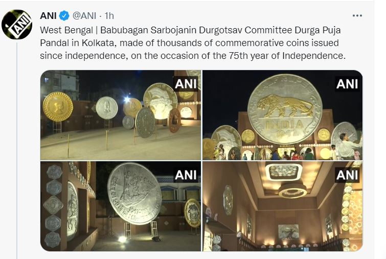 पश्चिम बंगाल की राजधानी कोलकाता में एक खास तरह का पंडाल बनाया गया है। स्वतंत्रता के 75वें वर्ष के अवसर पर स्वतंत्रता के बाद से जारी किए गए हजारों स्मारक सिक्कों से यह पंडाल बनाया गया है। कोलकाता के बाबूबगन सरबजनिन दुर्गोत्सव समिति ने इस खास दुर्गा पूजा पंडाल को बनाया है।