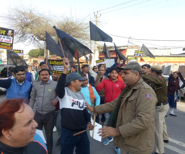 शाम करीब सवा चार बजे जैसे ही केजरीवाल का काफिला स्वतंत्र नगर मोड की तरफ मुड़ा कथित भाजपा कार्यकर्ताओं ने केजरीवाल हाय-हाय के नारे लगाने शुरू कर दिए। करीब दस मिनट तक मुख्यमंत्री के काफिले को वहीं पर रुकना पड़ा। कथित भाजपा कार्यकर्ता मुख्यमंत्री पर लोगों को गुमराह करने का आरोप लगा रहे थे। प्रदर्शनकारियों का नेतृत्व जिलाध्यक्ष नीलदमन खत्री कर रहे थे। आप की तरफ से मुख्यमंत्री की कार पर पत्थराव किए जाने का भी आरोप लगाया गया है। हालांकि, नीलदमन खत्री ने इस बात से साफ इनकार किया है।