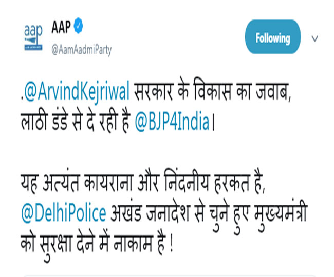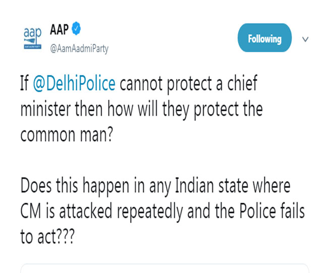 इस बारे में आम आदमी पार्टी ने ट्वीट करते हुए दिल्ली पुलिस पर सीएम को सुरक्षा नहीं देने का आरोप लगाया है। आप ने कहा कि जब मुख्यमंत्री को ही दिल्ली पुलिस सुरक्षा नहीं दे पा रही तो आम जनता को कैसे सुरक्षा देगी? क्या यह होता है कि किसी राज्य में सीएम पर लगातार हमले होते हैं और पुलिस सुरक्षा देने में नाकाम रहती है। आप ने भाजपा पर भी आरोप लगाते हुए कहा कि अरविंद केजरीवाल सरकार के विकास का जवाब भाजपा लाठी-डंडे से दे रही है।