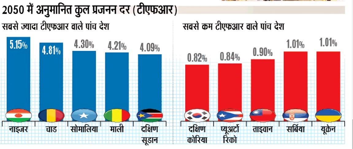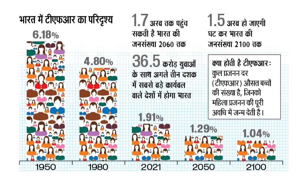 भारत में घटती प्रजनन दर ने सामाजिक और आर्थिक बदलाव लाए हैं। शहरीकरण परिवार नियोजन और आर्थिक दबाव के कारण टीएफआर रिप्लेसमेंट रेट 2.1% से नीचे पहुंच गया। इससे बुजुर्ग आबादी बढ़ेगी श्रमिकों की कमी होगी और जनसांख्यिकीय लाभांश का लाभ खत्म होगा। हालांकि यह संसाधनों के प्रबंधन और महिला सशक्तिकरण को बढ़ावा दे सकता है। जापान और दक्षिण कोरिया की स्थितियों से भारत को सतर्क रहने की जरूरत है।
