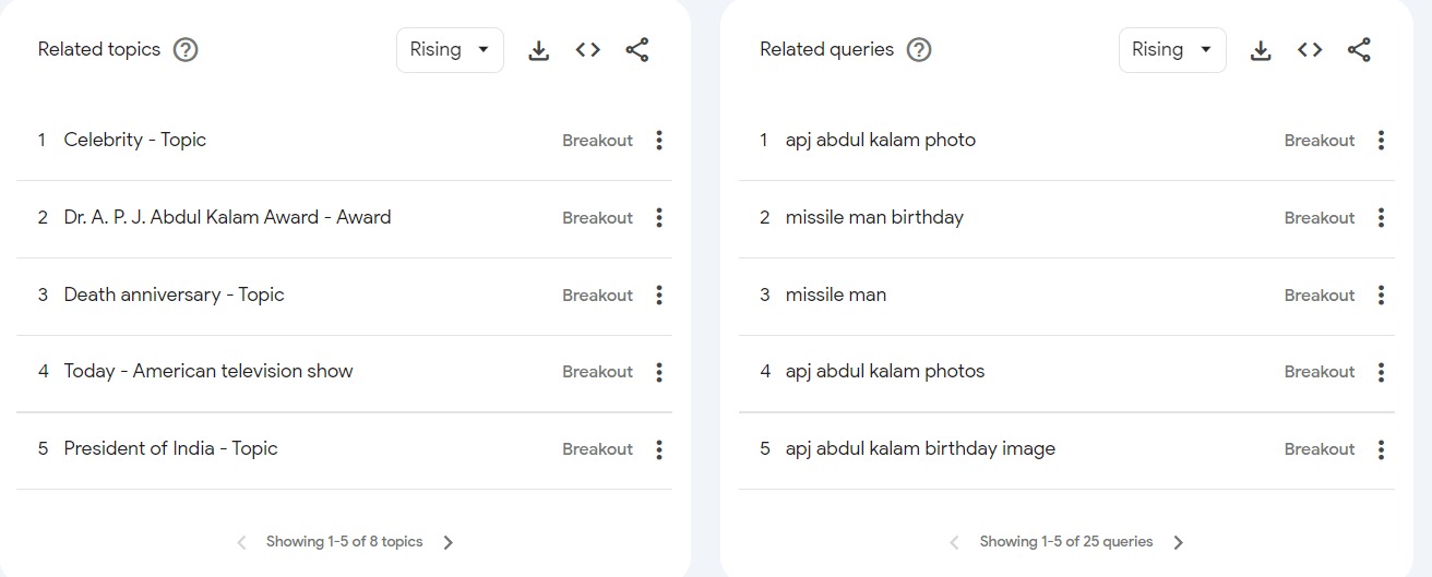 गूगल पर लोग एपीजे अब्दुल कलाम फोटो, मिसाइल मैन बर्थडे, मिसाइल मैन, एपीजे अब्दुल कलाम बर्थडे इमेज, डॉ. एपीजे अब्दुल कलाम अवार्ड जैसे कीवर्ड से सर्च कर रहे हैं।