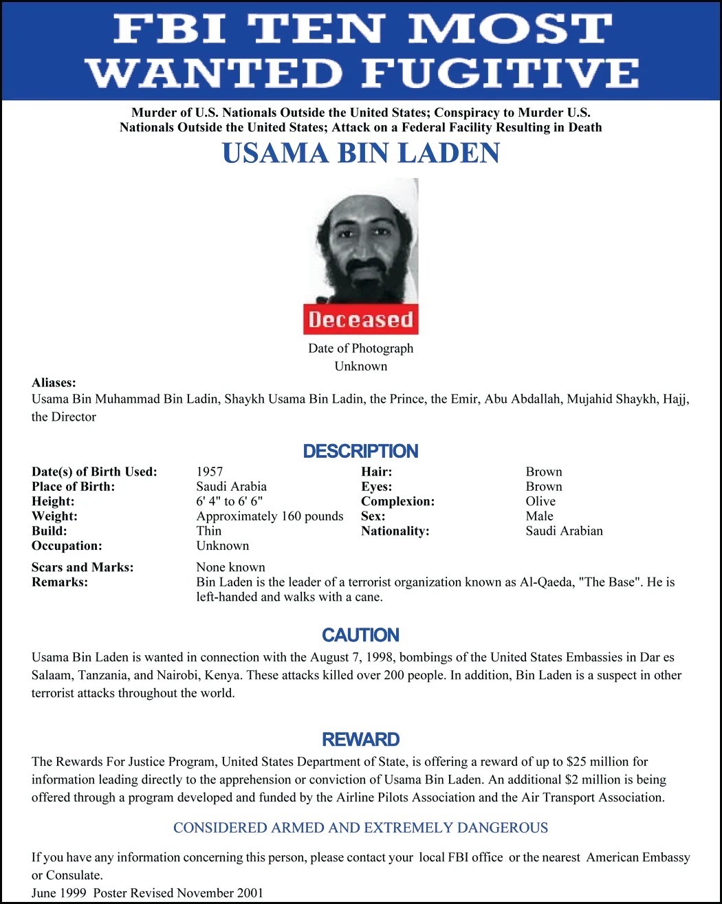 लादेन को ढूंढने के लिए अमेरिकन जांच एजेंसी एफबीआई ने इस पोस्टर को जारी किया था। FBI
