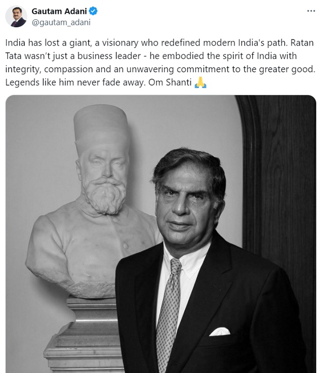 अडानी समूह के चेयरमैन गौतम अडानी ने ट्वीट कर कहा कि भारत ने एक दिग्गज, एक दूरदर्शी व्यक्ति को खो दिया है, जिसने आधुनिक भारत के मार्ग को फिर से परिभाषित किया। रतन टाटा केवल एक व्यापारिक नेता नहीं थे- उन्होंने भारत की भावना को ईमानदारी, करुणा और व्यापक भलाई के लिए एक अटूट प्रतिबद्धता के साथ मूर्त रूप दिया। उनके जैसे दिग्गज कभी नहीं मिटते। ओम शांति।