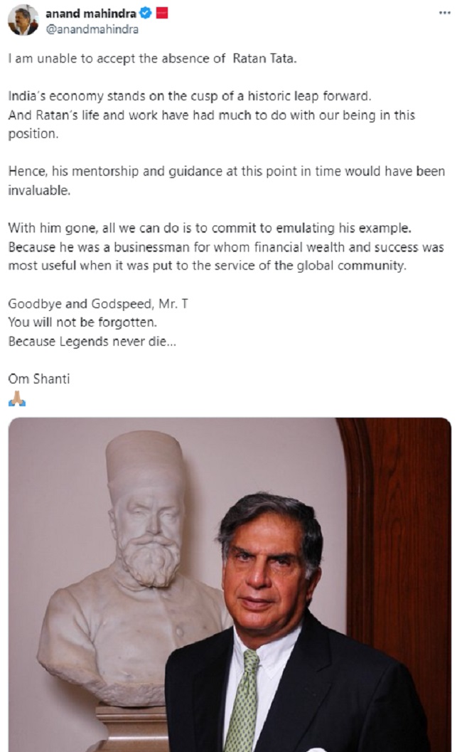 महिंद्रा समूह के चेयरमैन आनंद महिंद्रा ने ट्वीट किया, "मैं रतन टाटा की अनुपस्थिति को स्वीकार नहीं कर पा रहा हूं। भारत की अर्थव्यवस्था ऐतिहासिक छलांग लगाने के कगार पर है और रतन के जीवन और कार्य का हमारे इस स्थिति में होने में बहुत बड़ा योगदान है। इसलिए, इस समय उनका मार्गदर्शन और अमूल्य होता। उनके जाने के बाद, हम बस यही कर सकते हैं कि उनके उदाहरण का अनुकरण करने के लिए प्रतिबद्ध हों। क्योंकि वह एक ऐसे व्यवसायी थे जिनके लिए वित्तीय संपत्ति और सफलता सबसे उपयोगी तब थी जब इसे वैश्विक समुदाय की सेवा में लगाया जाता था। अलविदा और भगवान की कृपा हो। आपको भुलाया नहीं जाएगा। क्योंकि किंवदंतियां कभी नहीं मरतीं... ओम शांति।