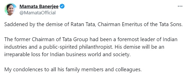 पश्चिम बंगाल की मुख्यमंत्री ममता बनर्जी ने ट्वीट किया, टाटा संस के मानद चेयरमैन रतन टाटा के निधन से दुखी हूं। टाटा समूह के पूर्व चेयरमैन भारतीय उद्योगों के अग्रणी नेता और जनहितैषी परोपकारी व्यक्ति थे। उनका निधन भारतीय व्यापार जगत और समाज के लिए एक अपूरणीय क्षति होगी। उनके सभी परिवार के सदस्यों और सहयोगियों के प्रति मेरी संवेदनाएं।