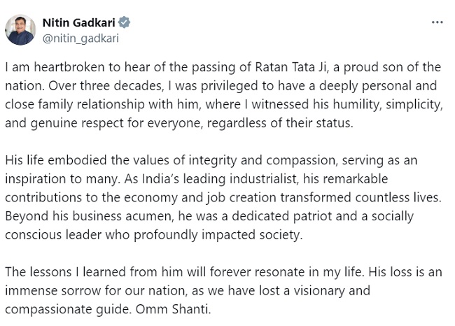 केंद्रीय मंत्री नितिन गडकरी ने ट्वीट किया, देश के गौरवशाली सपूत रतन टाटा जी के निधन की खबर सुनकर मैं स्तब्ध हूं। तीन दशकों से अधिक समय तक मुझे उनके साथ एक गहरा व्यक्तिगत और करीबी पारिवारिक संबंध रखने का सौभाग्य मिला, जहां मैंने उनकी विनम्रता, सादगी और सभी के प्रति वास्तविक सम्मान देखा, चाहे उनकी स्थिति कुछ भी हो। उनके जीवन में ईमानदारी और करुणा के मूल्य समाहित थे, जो कई लोगों के लिए प्रेरणा का स्रोत रहे।