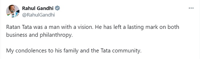 कांग्रेस सांसद और लोकसभा में विपक्ष के नेता राहुल गांधी (Rahul Gandhi Reaction) ने ट्वीट किया, "रतन टाटा एक दूरदर्शी व्यक्ति थे। उन्होंने व्यापार और परोपकार दोनों पर अमिट छाप छोड़ी है। उनके परिवार और टाटा समुदाय के प्रति मेरी संवेदनाएं।