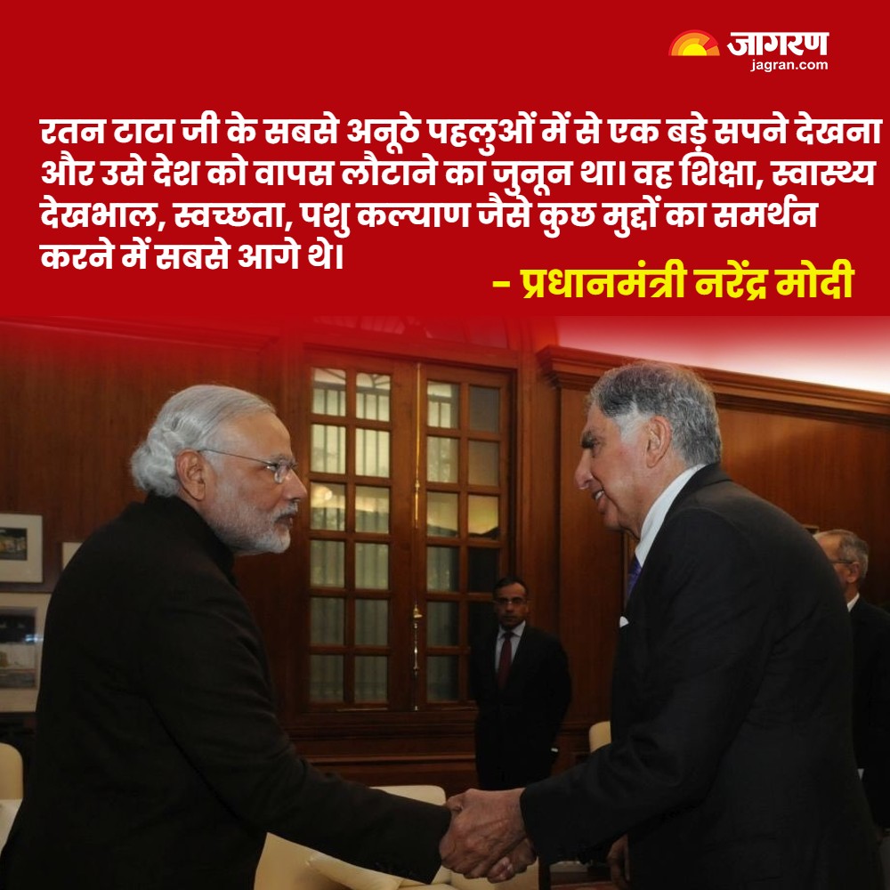 प्रधानमंत्री नरेंद्र मोदी ने अपनी एक पोस्ट में लिखा कि मेरा मन रतन टाटा जी के साथ अनगिनत संवादों से भरा हुआ है। जब मैं गुजरात का मुख्यमंत्री था तो मैं उनसे अक्सर मिलता था। हमने विभिन्न मुद्दों पर विचारों का आदान-प्रदान किया। मुझे उनका दृष्टिकोण बहुत समृद्ध लगा। जब मैं दिल्ली आया तो ये बातचीत जारी रही। उनके निधन से बेहद दुख हुआ। इस दुख की घड़ी में मेरी संवेदनाएं उनके परिवार, दोस्तों और प्रशंसकों के साथ हैं। ॐ शांति।