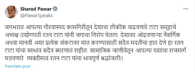 एनसीपी-एससीपी प्रमुख शरद पवार ने ट्वीट किया, दुनिया भर में अपनी शानदार उपलब्धियों से देश का नाम ऊंचा करने वाले, टाटा समूह के चेयरमैन, उद्योगपति रतन टाटा ने दुनिया को अलविदा कह दिया। देश पर आने वाले हर प्राकृतिक या मानवीय संकट से उबरने के लिए हमेशा मदद का हाथ बढ़ाने वाले रतन टाटा के स्वभाव को हमेशा याद किया जाएगा। सामाजिक चेतना के माध्यम से अपनी सफलता का मार्ग प्रशस्त करने वाले व्यक्तित्व रतन टाटा को भावभीनी श्रद्धांजलि।