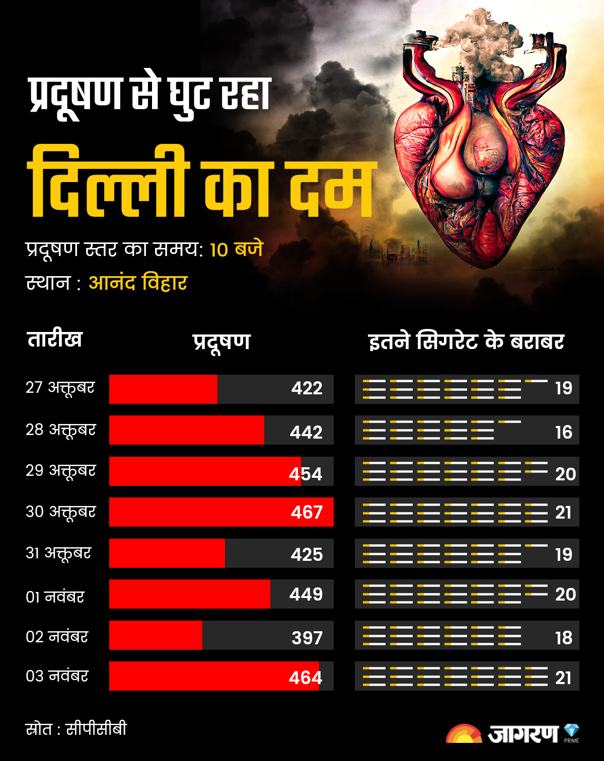 बर्कले अर्थ साइंटफिक पेपर के अनुसार एक सिगरेट से 22 माइक्रोग्राम प्रति क्यूबिक मीटर प्रदूषण फैलता है। इस तरह दिल्ली में हर व्यक्ति इन दिनों जिस प्रदूषित हवा में सांस ले रहा है, वह रोजाना 20 सिगरेट पीने के बराबर है। यानी बीते आठ दिनों में दिल्लीवासी प्रदूषण के तौर पर 153 सिगरेट पी चुके हैं।