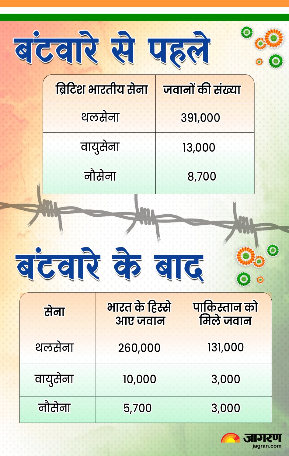 ब्रिटेन के नेशनल आर्मी म्यूजियम की रिपोर्ट के मुताबिक, विभाजन के बाद दो तिहाई जवान भारत को मिले और एक तिहाई पाकिस्तान चले गए। इस तरह 260,000 जवानों ने भारतीय सेना और करीब 140,000 ने पाकिस्तान को चुना था। पाकिस्तान को चुनने वालों में ज्यादातर मुस्लिम थे।
