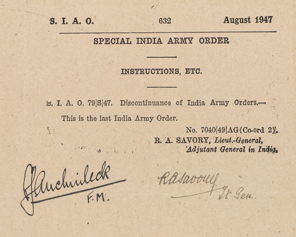 14 अगस्त 1947 को पुरानी भारतीय सेना को खत्म करने का आदेश आ गया। ऑर्डर पर औचिनलेक और मेजर जनरल रेजिनाल्ड सेवरी के हस्ताक्षर थे। ब्रिटिश भारतीय सेना का यह आखिरी आदेश था।