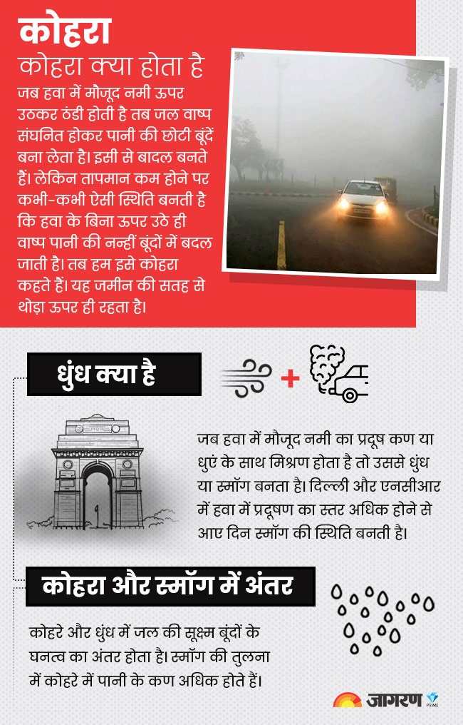 भारत मौसम विज्ञान विभाग (IMD) के मुताबिक कोहरा तब होता है जब ठंड के मौसम और उच्च आर्द्रता के चलते पानी की बूदें काफी संघनित हो जाती हैं। प्राकृतिक कोहरे का रंग सफेद होता है लेकिन उत्तर पश्चिम भारत में हवा में मौजूद प्रदूषक कणों के चलते इसका रंग बदल जाता है। उदाहरण के तौर पर दिल्ली में गाड़ियों से निकलने वाले धुएं के कारण कोहरे का रंग आमतौर पर ग्रे होता है। अध्ययन में पाया गया कि दिल्ली और एनसीआर में कोहरे में क्लोराइड 24 फीसदी, कैल्शियम के कण लगभग 23 फीसदी, अमोनियम के कण 15 फीसदी और नाइट्रेट लगभग 14 फीसदी शामिल हैं। दिल्ली के कोहरे में सल्फेट के कण लगभग 14 फीसदी, मैग्नीशियम के लगभग 4 फीसदी और सोडियम के कण लगभग 3 फीसदी पाए गए। पोटेशियम लगभग 2 फीसदी और फ्लोराइड लगभग एक फीसदी था।