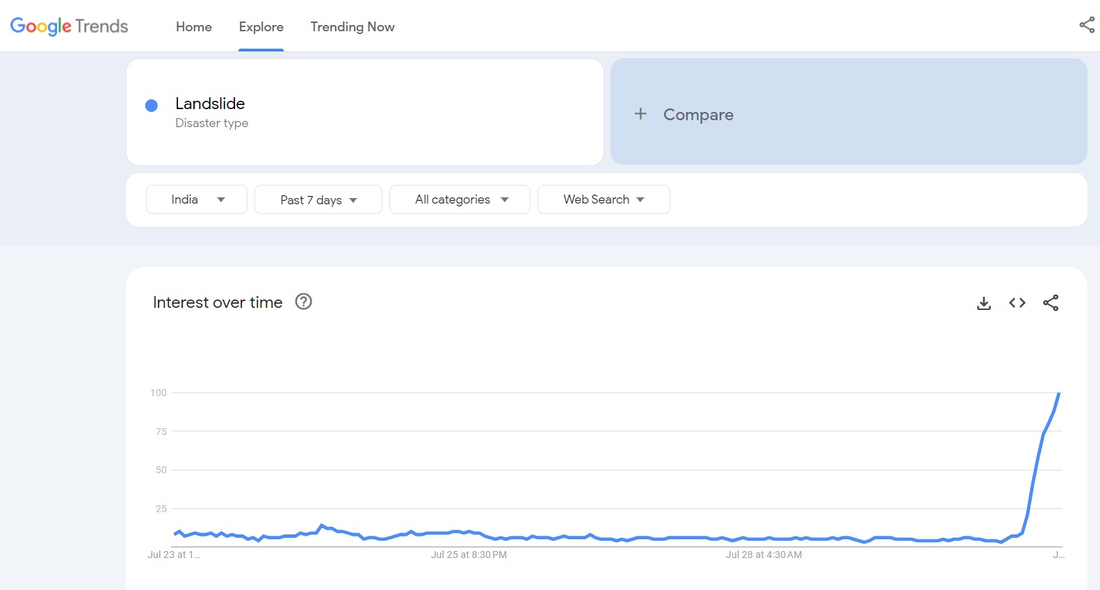 केरल के वायनाड में हुए लैंडस्लाइड के बाद पूरे देश और दुनिया के कई हिस्सों में इसके बारे में गूगल पर खोज बढ़ गई है। मंगलवार की सुबह से ही इसका सर्च ग्राफ लगतार ऊपर की ओर जा रहा है।