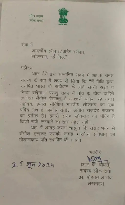 दरअसल, मोहनलालगंज से सपा सांसद आरके चौधरी ने बुधवार को लोकसभा अध्यक्ष को पत्र लिखकर संसद से सेंगोल हटाने की मांग की है।