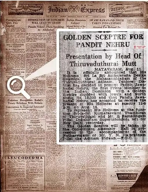 14 अगस्त, 1947 की रात 11.45 बजे यानी आजादी मिलने से सिर्फ 15 मिनट पहले थिरुवदुथुरै अधीनम मठ के पुजारी ने राजदंड माउंटबेटन को दिया। चोल शासन की परंपरा के मुताबिक, उस पर पवित्र जल छिड़का गया।