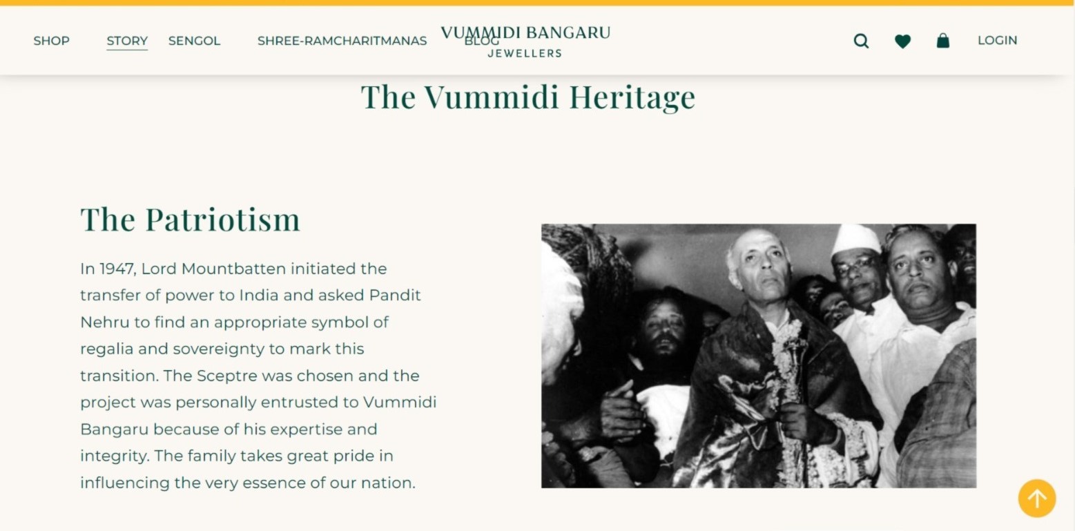चेन्नई में वुम्मिदी बंगारू ज्वेलर्स नाम से एक ब्रांड है। यह ब्रांड वुम्मिदी परिवार का है, जिसकी 5वीं पीढ़ी आज बिजनेस संभाल रही है। परिवार करीब 120 साल से चेन्नई में इस धंधे में है। बतया जाता है कि इससे पहले भी इनके पुरखे वेल्लोर के एक गांव में गहन बनाने का काम करते थे। इस ब्रांड ने अपनी वेबसाइट पर दावा किया है कि माउंटबेटन ने जो सेंगोल नेहरू को सौंपा था, उसे इनके पुरखों ने बनाया था।
