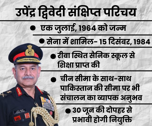 - एक जुलाई, 1964 को जन्मे लेफ्टिनेंट जनरल उपेंद्र द्विवेदी 15 दिसंबर, 1984 को सेना की जम्मू एंड कश्मीर राइफल्स में शामिल हुए थे। लगभग 40 वर्षों की अपनी लंबी एवं विशिष्ट सेवा के दौरान उन्होंने विभिन्न कमान, स्टाफ एवं विदेश की नियुक्तियों में कार्य किया है। कमान की उनकी नियुक्तियों में रेजीमेंट की कमान (18 जम्मू एंड कश्मीर राइफल्स), ब्रिगेड (सेक्टर 26 असम राइफल्स), असम राइफल्स के डीआइजी ईस्ट, कोर (नौवीं कोर) एवं उत्तरी कमान के प्रमुख (2022 से 2024) शामिल हैं।