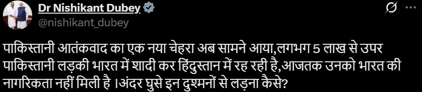 डिजिटल डेस्क, नई दिल्ली। भारतीय जनता पार्टी (BJP) के गोड्डा से सांसद निशिकांत दुबे ने पाकिस्तान पर हमला बोला है। उन्होंने X पर पोस्ट कर कहा कि पाकिस्तान से संबंधित आतंकवाद का एक नया चेहरा अब सामने आया है। निशिकांत दुबे ने पाकिस्तानी लड़कियों के मुद्दे को उठाया जो शादी के बाद भारत आई हैं। लेकिन अभी तक उन्हें भारतीय नागरिकता नहीं मिली है।