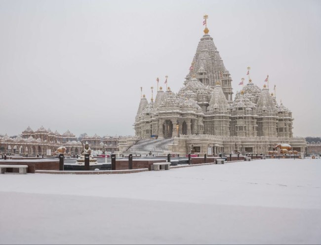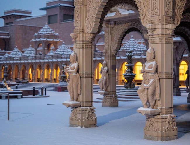 वहीं, इस समय यहां सर्दी के मौसम में बर्फबारी हो रही है। जिसके बाद हिंदू मंदिर, बीएपीएस स्वामीनारायण अक्षरधाम की मनमोहक तस्वीरें सामने आई हैं।
