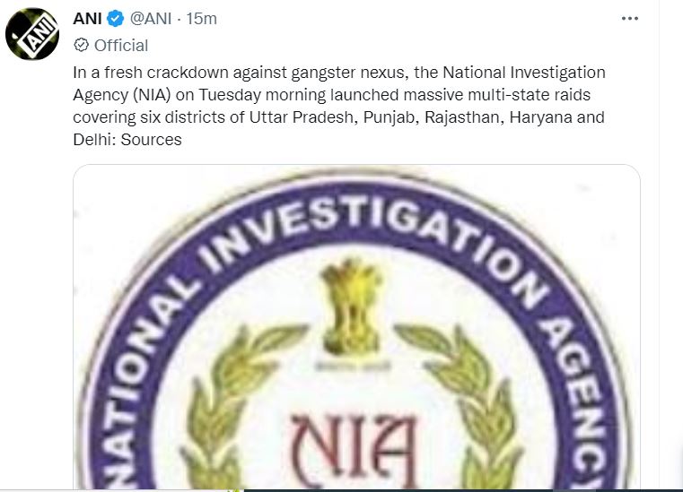 नई दिल्ली, एएनआइ। राष्ट्रीय जांच एजेंसी (National Investigation Agency, NIA) ने मंगलवार को उत्तर प्रदेश, पंजाब और दिल्ली समेत कई राज्यों में छापेमारी की। समाचार एजेंसी एएनआइ ने अपने सूत्रों के हवाले से बताया कि गैंगस्टर के ठिकानों का भंडाफोड़ करने के लिए एनआइए ने मंगलवार सुबह दिल्ली, पंजाब, राजस्थान, हरियाणा और यूपी के कई ठिकानों पर छापेमारी की है।