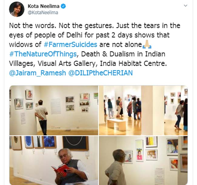 नई दिल्ली [स्मिता]। हाल में एक खबर आई थी कि झारखंड में सौ से अधिक योजनाएं चलने के बावजूद वहां किसान आत्महत्या कर रहे हैं। यही हाल महाराष्ट्र और तेलंगाना के किसानों का भी है। किसानों की आत्महत्या के बाद विषम परिस्थितियों से जूझ रहे उनके परिवार की दुर्दशा को देखकर कोटा नीलिमा विचलित हो गईं और पत्रकारिता की नौकरी छोड़कर उन लोगों की जिंदगियों पर रिसर्च करने लगीं। भिंड और विदर्भ में हुई किसान आत्महत्या और उनके पीड़ित परिवार पर अभी दिल्ली में पेंटिंग की प्रदर्शनी लगाई गई है। उनकी किताब 'विडोज ऑफ विदर्भ’ भी इन दिनों चर्चा में है।