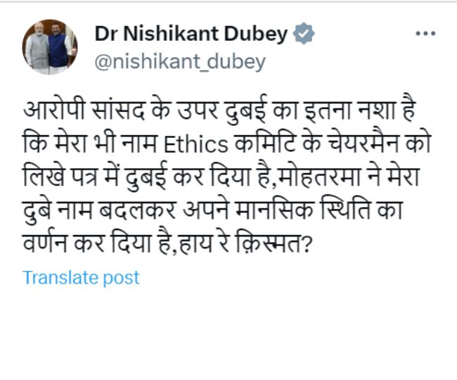 निशिकांत दुबे ने अपने एक्स हैंडल पर लिखा, आरोपी सांसद के उपर दुबई का इतना नशा है कि मेरा भी नाम एथिक्स कमेटी के चेयरमैन को लिखे पत्र में दुबई कर दिया है। भाजपा सांसद ने हैरानी जताते हुए कहा, मोहतरमा ने मेरा 'दुबे' नाम बदलकर अपने मानसिक स्थिति का वर्णन कर दिया है।
