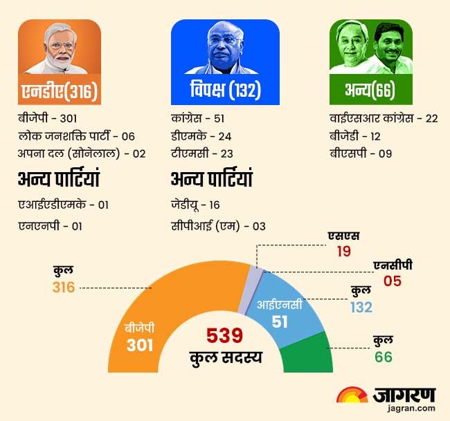 आइए जानते हैं कि सरकार यानी एनडीए, 'इंडिया' और जो दल किसी के साथ शामिल नहीं हैं उनकी सांसदों के हिसाब से क्या स्थिति है।