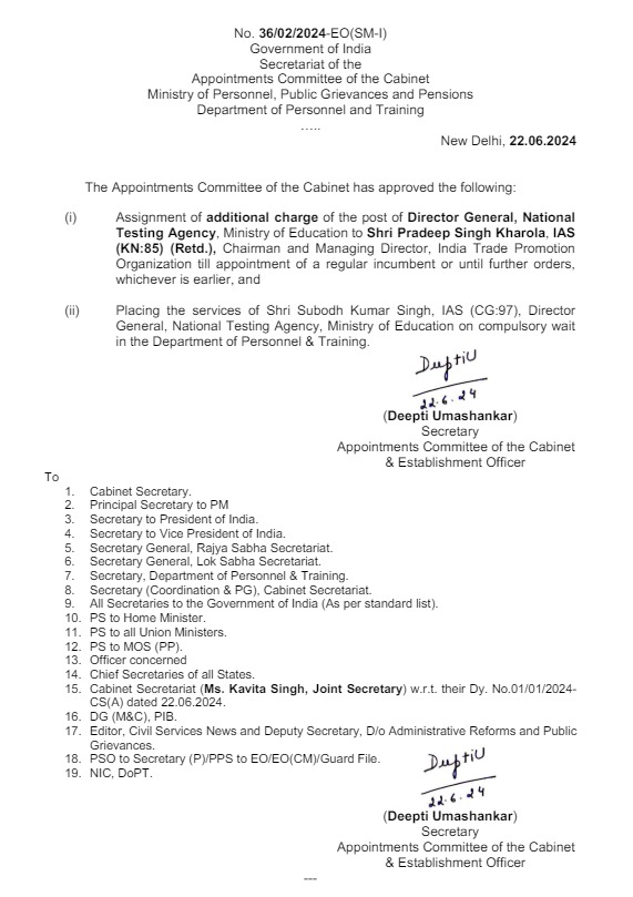 नीट-यूजी और यूजीसी-नेट परीक्षाओं के आयोजन में अनियमितताओं के आरोपों के मद्देनजर राष्ट्रीय परीक्षण एजेंसी के प्रमुख सुबोध कुमार सिंह को शनिवार रात उनके पद से हटा दिया गया है। उन्हें कार्मिक एवं प्रशिक्षण विभाग में अनिवार्य प्रतीक्षा पर रखा गया है। अगले आदेश तक उनके स्थान पर 1985 बैच के सेवानिवृत्त अधिकारी प्रदीप सिंह करोला को नियुक्त किया गया है।