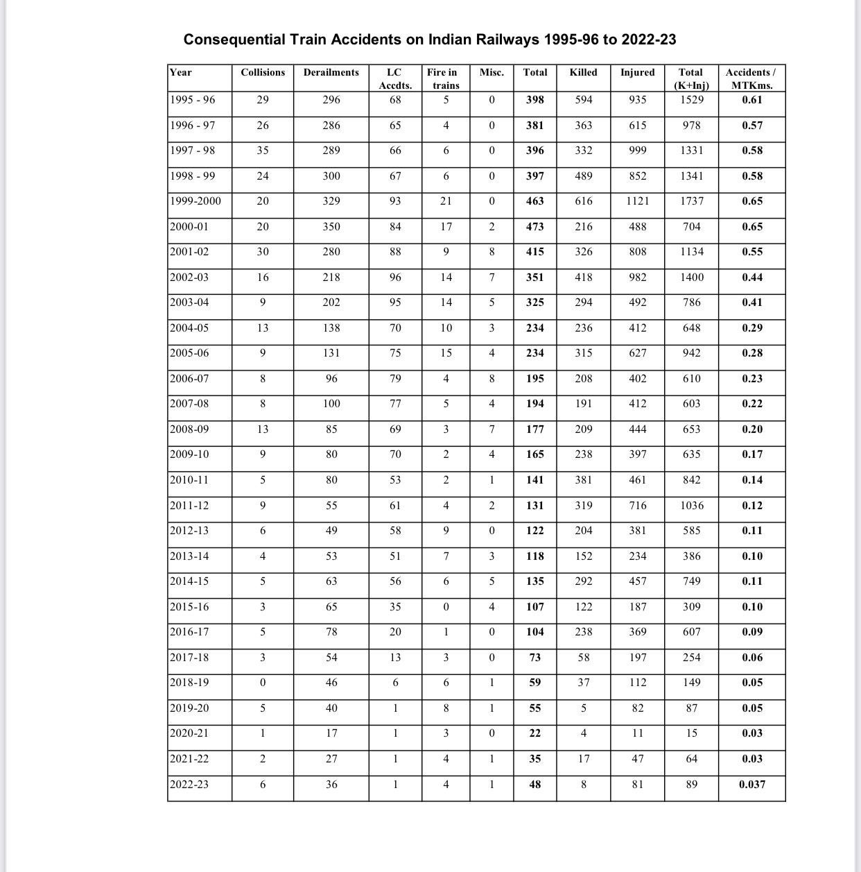 साल 1995-96 से लेकर 2022-23 तक हुए रेल हादसों की लिस्ट