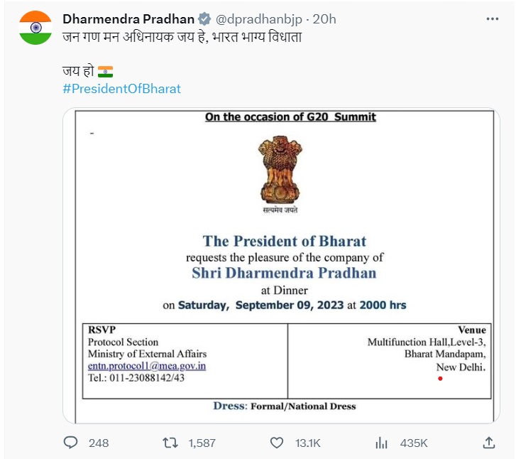बता दें कि इंडिया का नाम बदल कर भारत किए जाने वाले मुद्दे पर भाजपा के कई नेताओं ने मंगलवार को अपनी प्रतिक्रिया दी। केंद्रीय मंत्री धर्मेंद्र प्रधान ने 'एक्स' पर राष्ट्रपति की ओर से रात्रिभोज के निमंत्रण की एक तस्वीर पोस्ट की और राष्ट्रगान की कुछ पंक्तियां लिखीं।